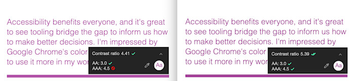: Math.min(yiq, threshold) - Math.max(yiq, threshold);After making these changes, the complimentary will now have improved contrast. Here's an example where it made an improvement from Level AA to Level AAA: